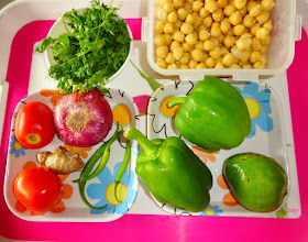 Today's Chana Masala recipe is an interesting amalgamation of Kabuli chana, peppers and raw mangoes. Sounds yummy, isn't it! This recipe is my creativity. This recipe is light version of Chana masala..
